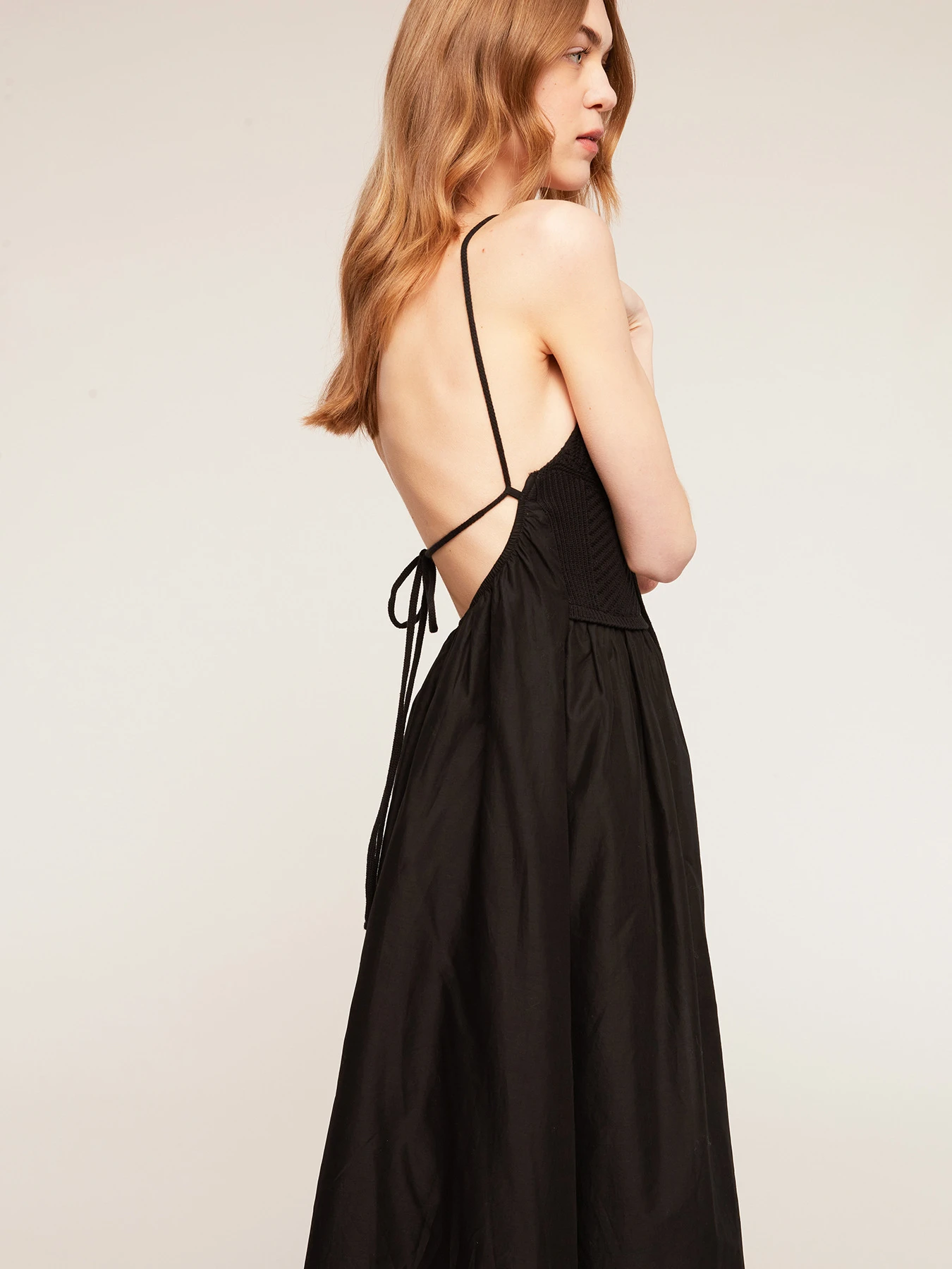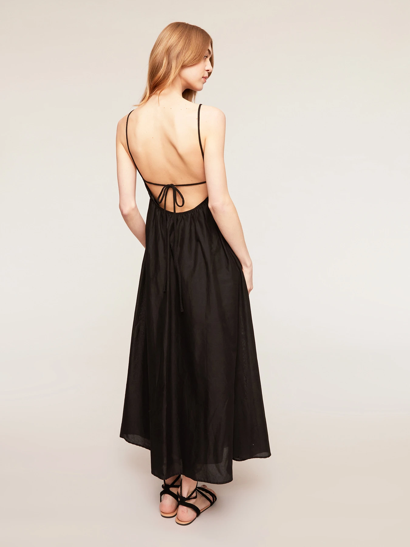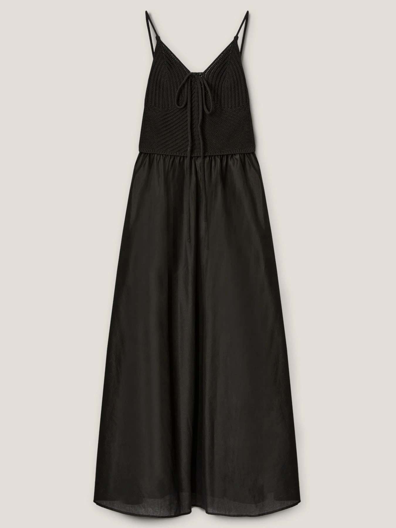 Vestito lungo con corpino in crochet 100% cotone; scollo a cuore e spalline fini; gonna lunga in voile di cotone.