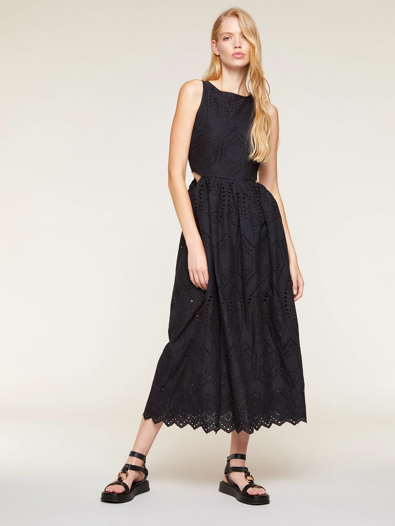 Vestito lungo in pizzo sangallo misto cotone lyocell con fodera interna; scollatura a barca con apertura nel centro dietro a zip; modello smanicato a spalla larga, dettaglio cut-out laterale, gonna lunga svasata sul fondo.