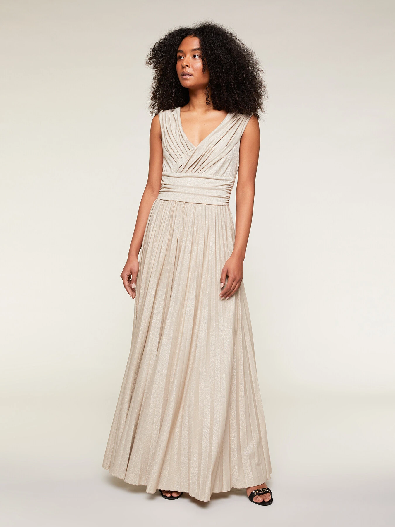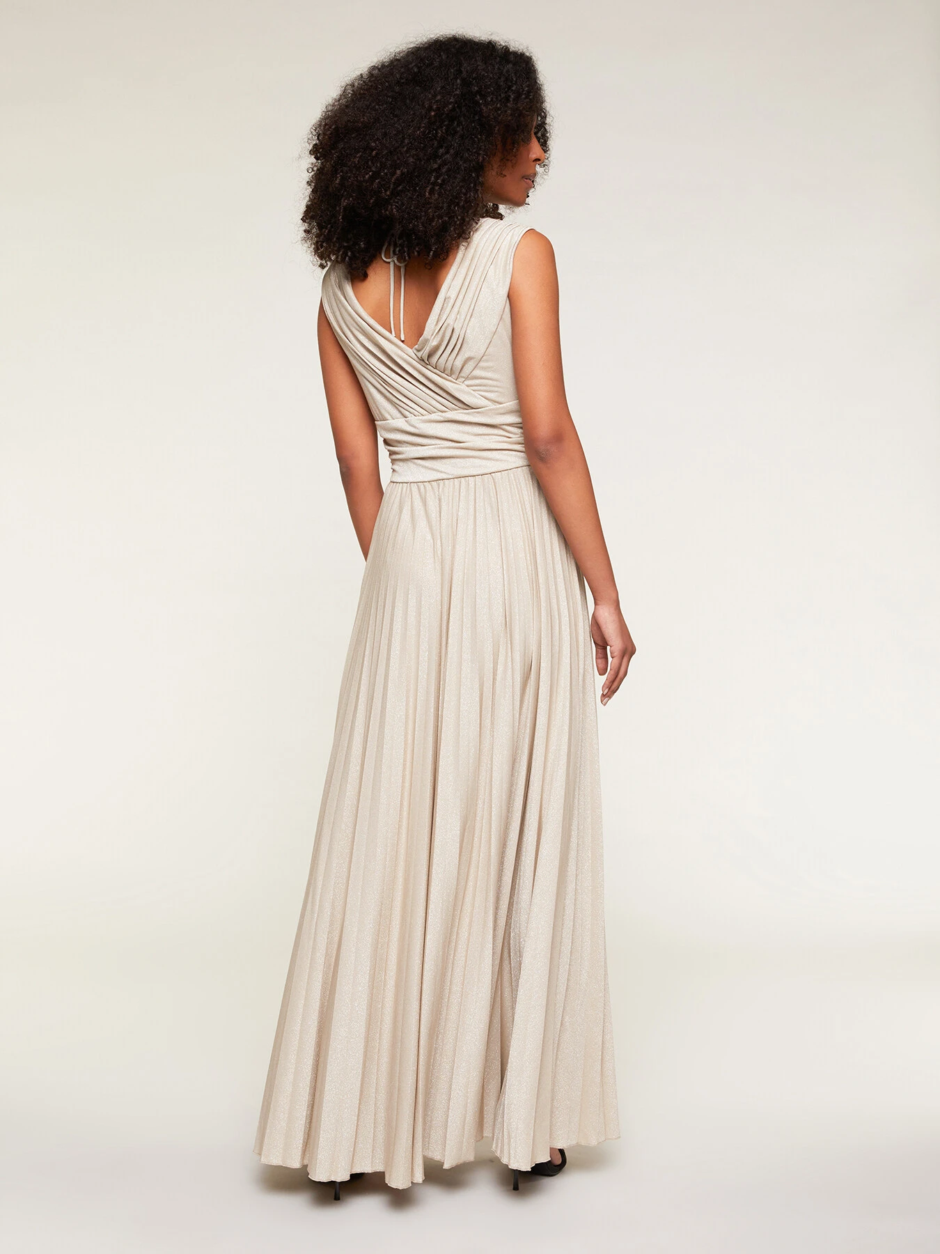 Vestito lungo in jersey lurex tinta unita; corpino drappeggiato con scollo a v e motivo ad incrocio; gonna lunga con lavorazione plissé.