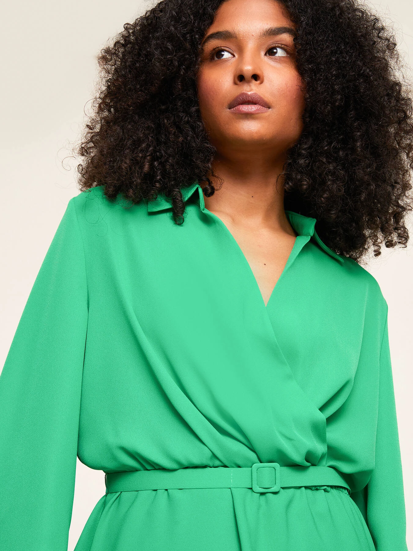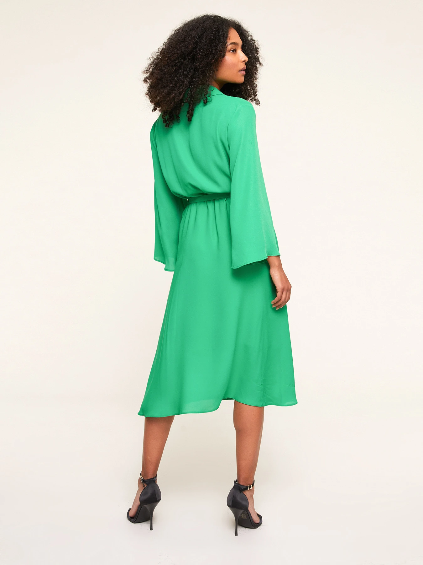 Vestito tinta unita in doppia georgette; chiusura frontale con colletto a vela e motivo ad incrocio, elastico interno in vita, cintura tono su tono; gonna a ruota lunghezza midi, maniche lunghe svasate sul fondo.