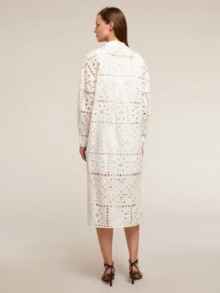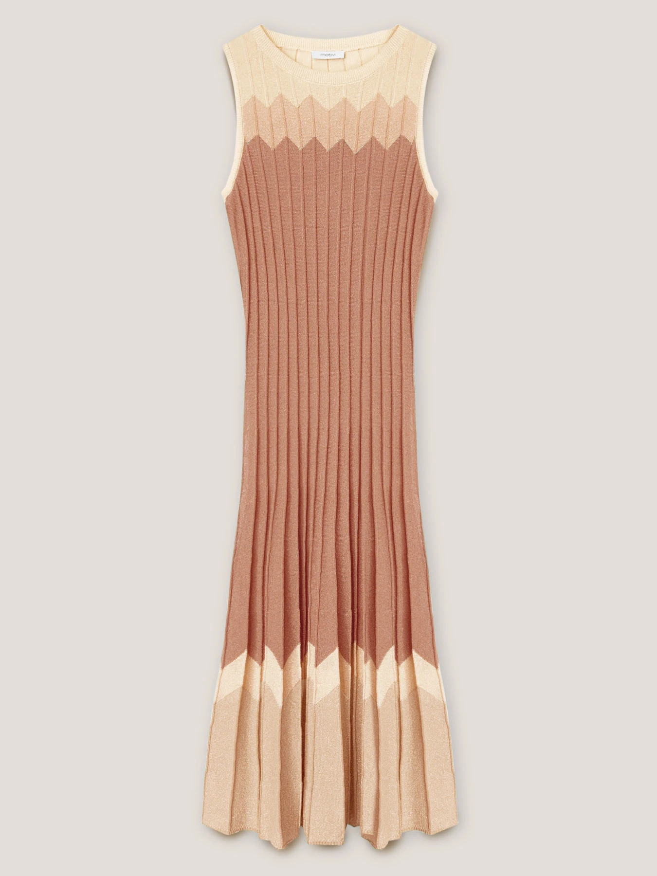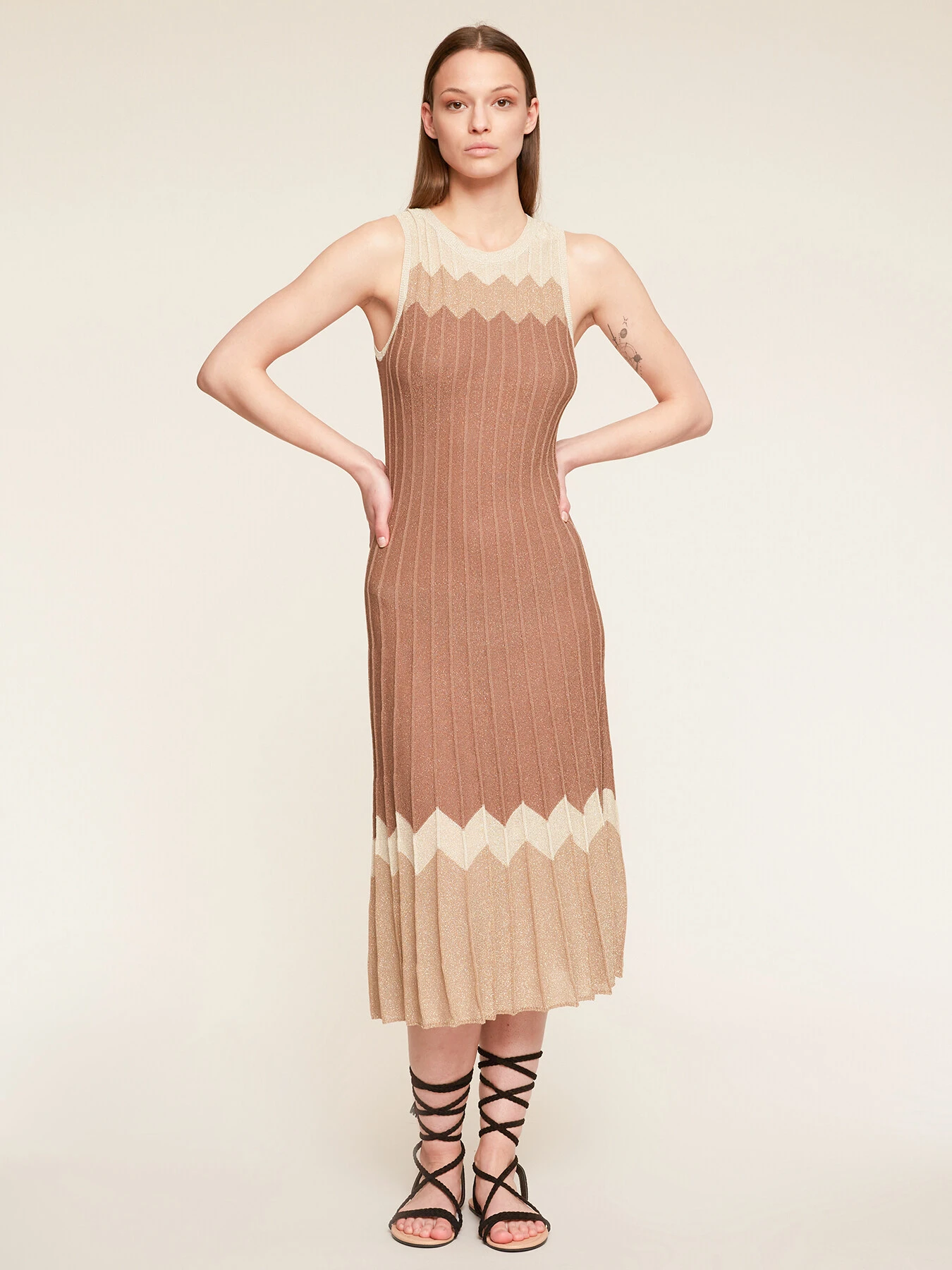 Vestito midi in maglia misto viscosa lurex punto plissé; modello senza maniche con spalla larga e scollo tondo; fantasia chevron sul fondo.