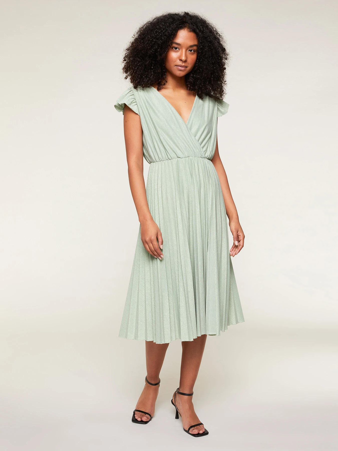 Vestito midi in jersey lurex tinta unita; corpino drappeggiato con scollo a v e motivo ad incrocio, maniche corte ad aletta; gonna con lavorazione plissé.