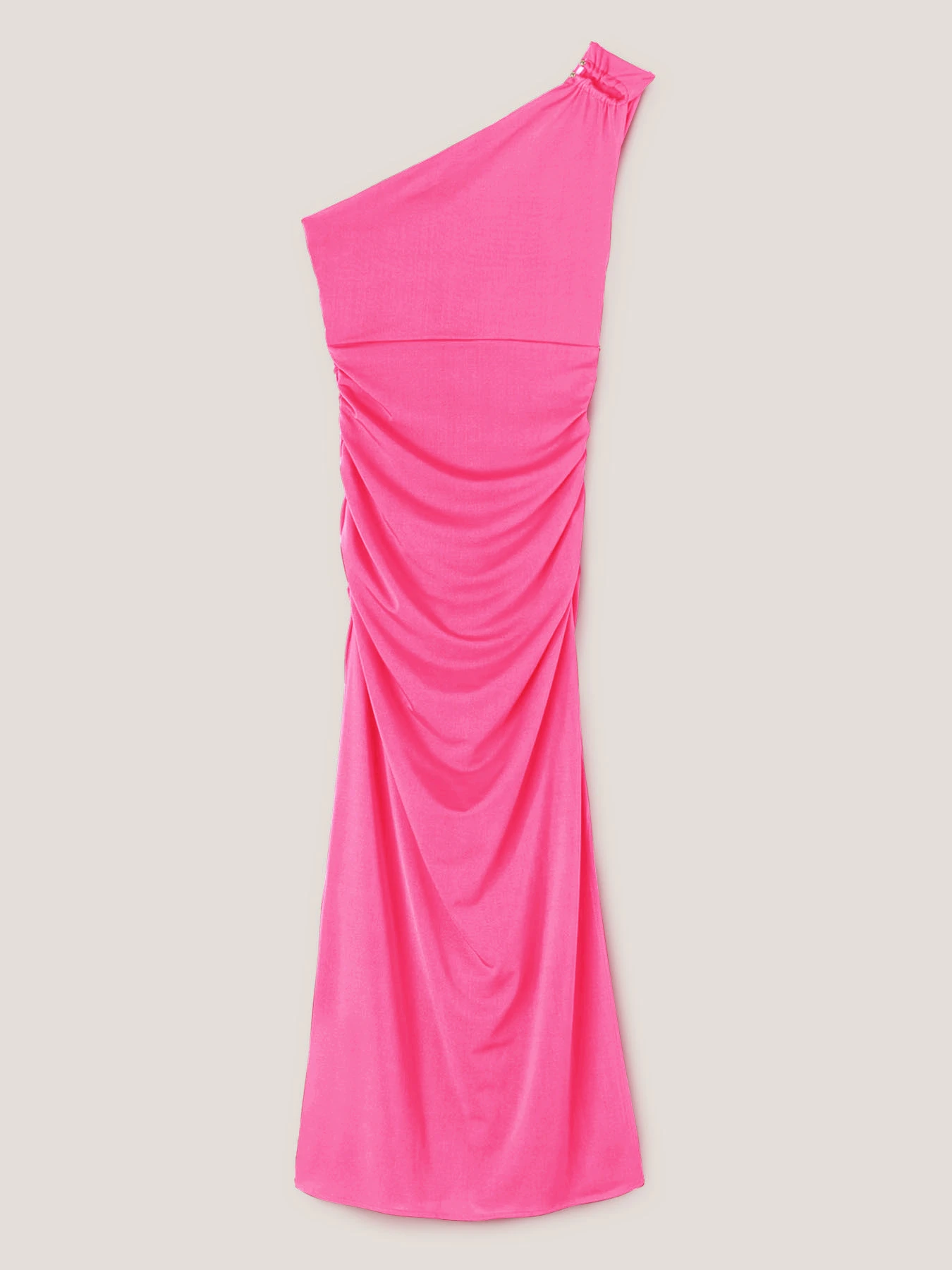 Vestito estivo in jersey tecnico tinta unita; modello monospalla senza maniche; gonna lunga con motivo a drappeggio e arricci, vestibilità slim.