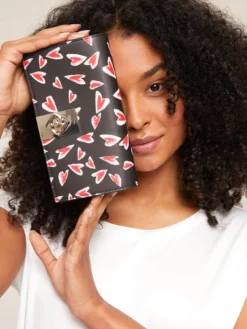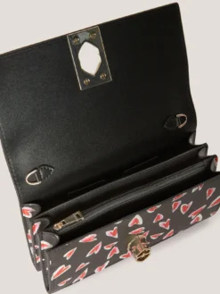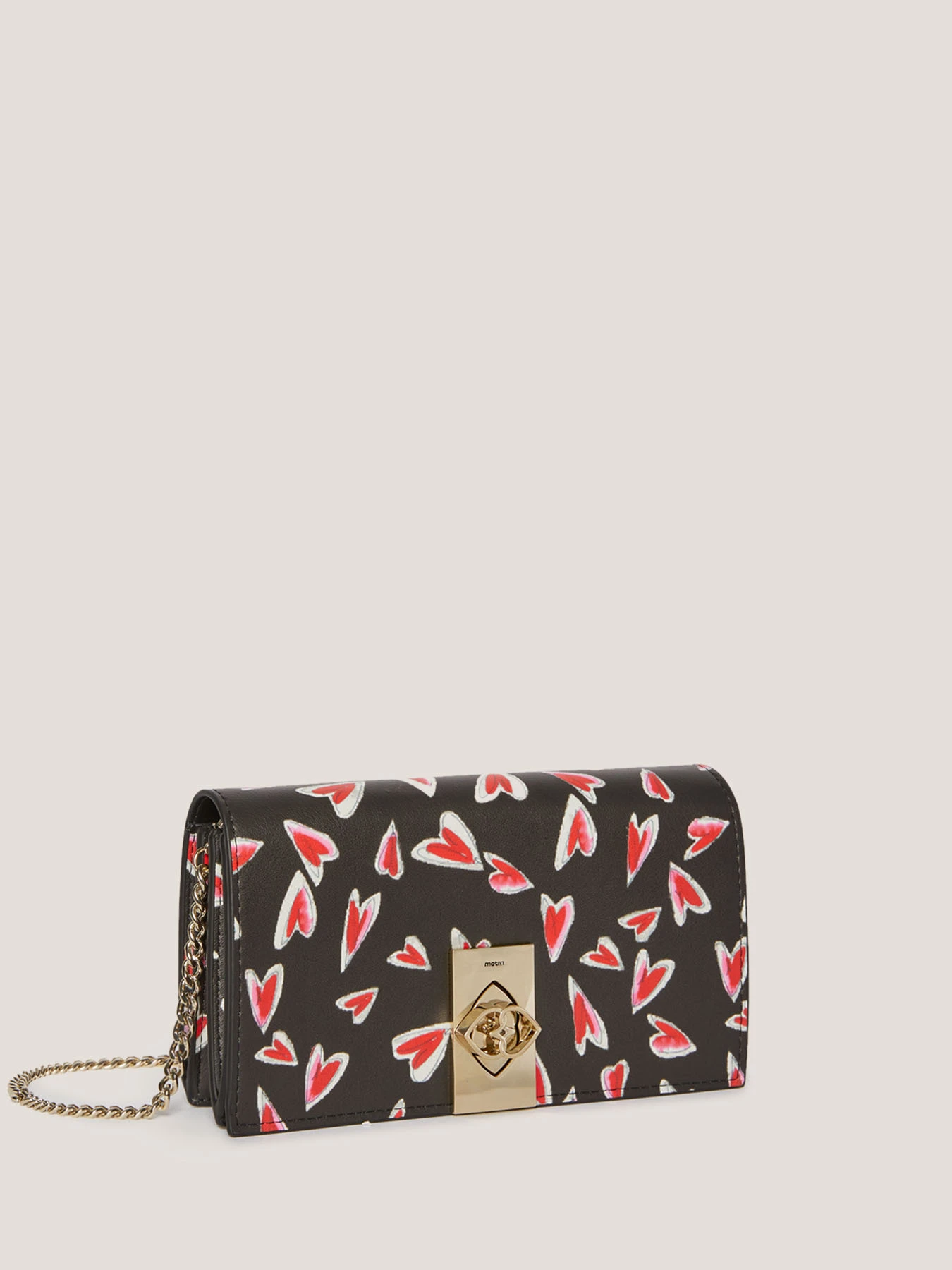 Wallet Bag in similpelle fantasia cuori; chiusura con nottolino Double Love, tracolla in catena metallica, tasche interne; dimensioni: altezza 10 cm, larghezza 19 cm, ampiezza 4 cm.